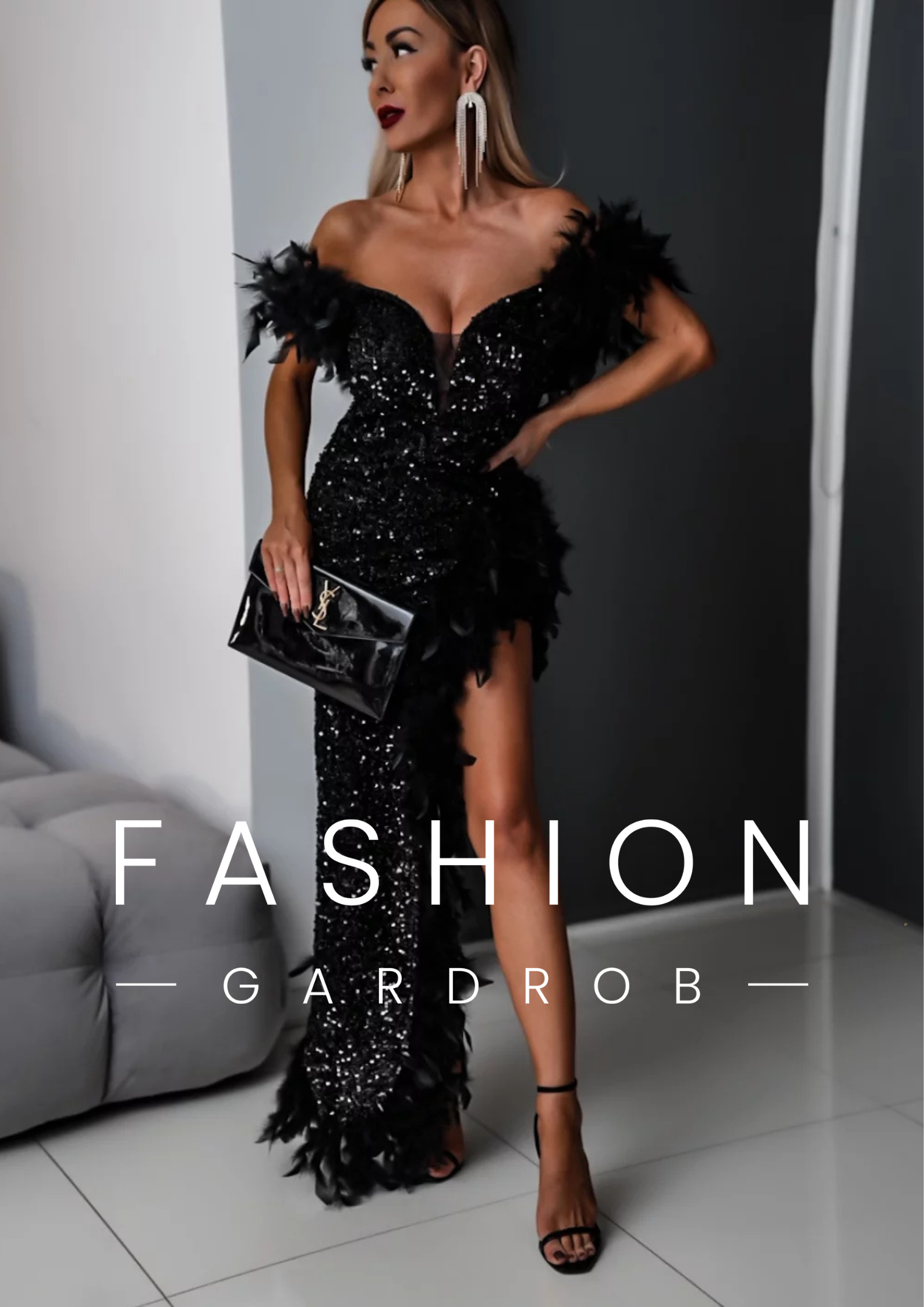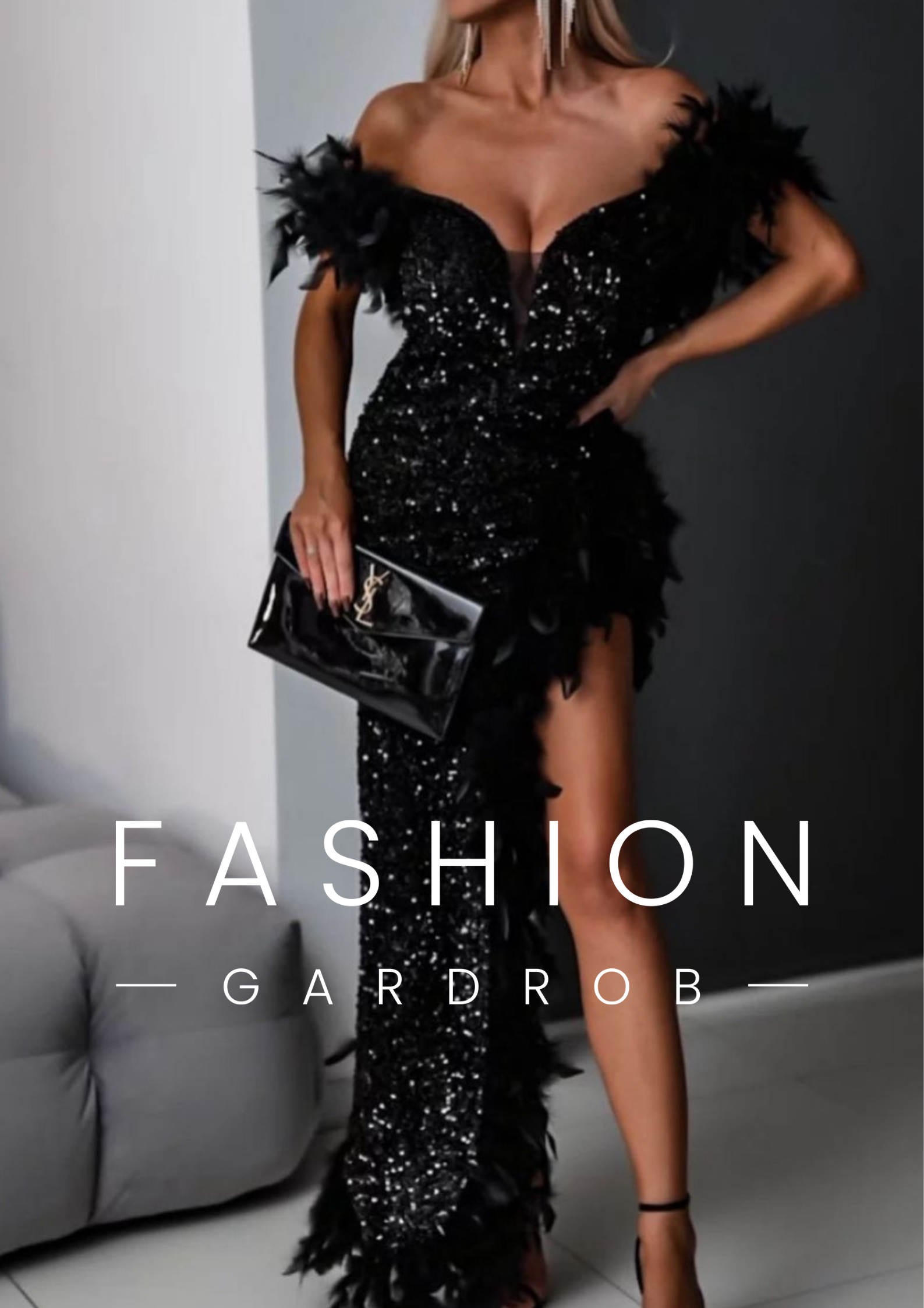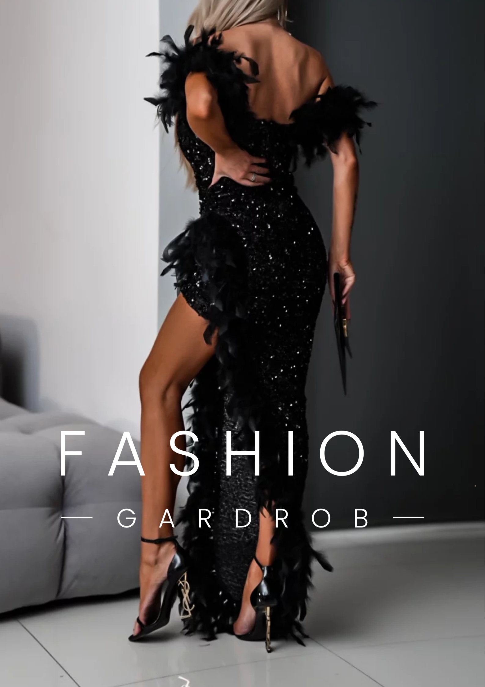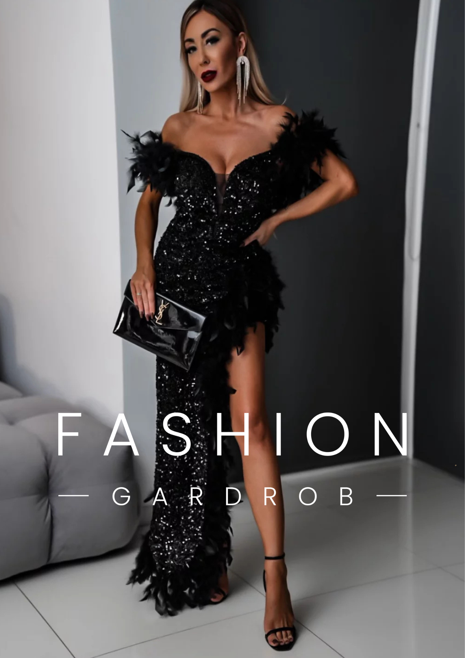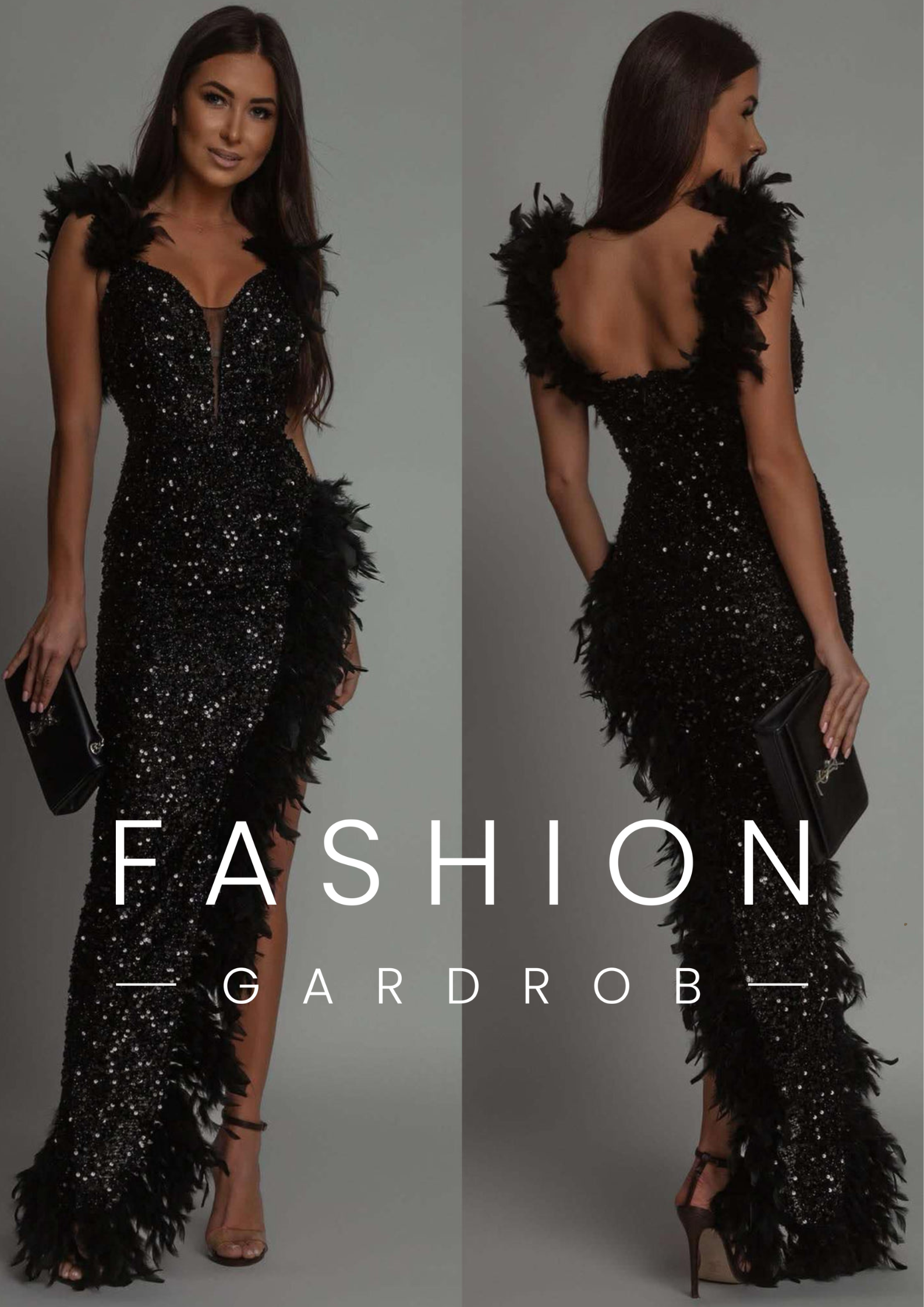 A képen látható elegáns, fekete estélyi ruha flitterekkel és tollakkal díszített, kétféle vállkialakítással hordható. A ruha off-shoulder (vállra ejtett) kialakítása lehetőséget ad arra, hogy két különböző stílusban viseld: