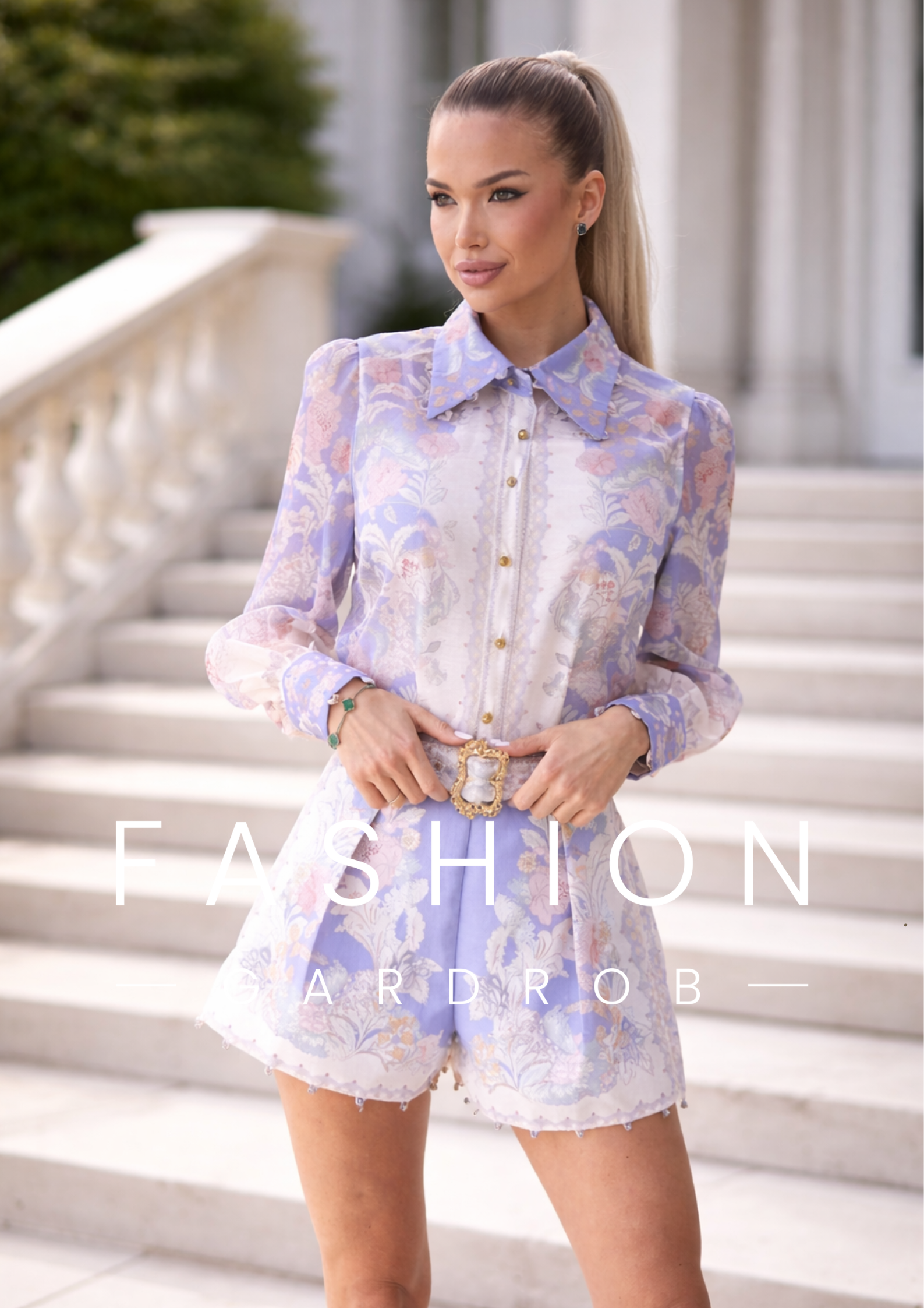 Az áttetsző, lágy esésű ujjmegoldás nőies mozgást biztosít, a magas derekú szabás pedig gyönyörűen kiemeli az alakot. A díszes öv elegáns fókuszpontként hangsúlyozza a derekat, míg a rövidnadrág játékos, mégis stílusos összhatást teremt.