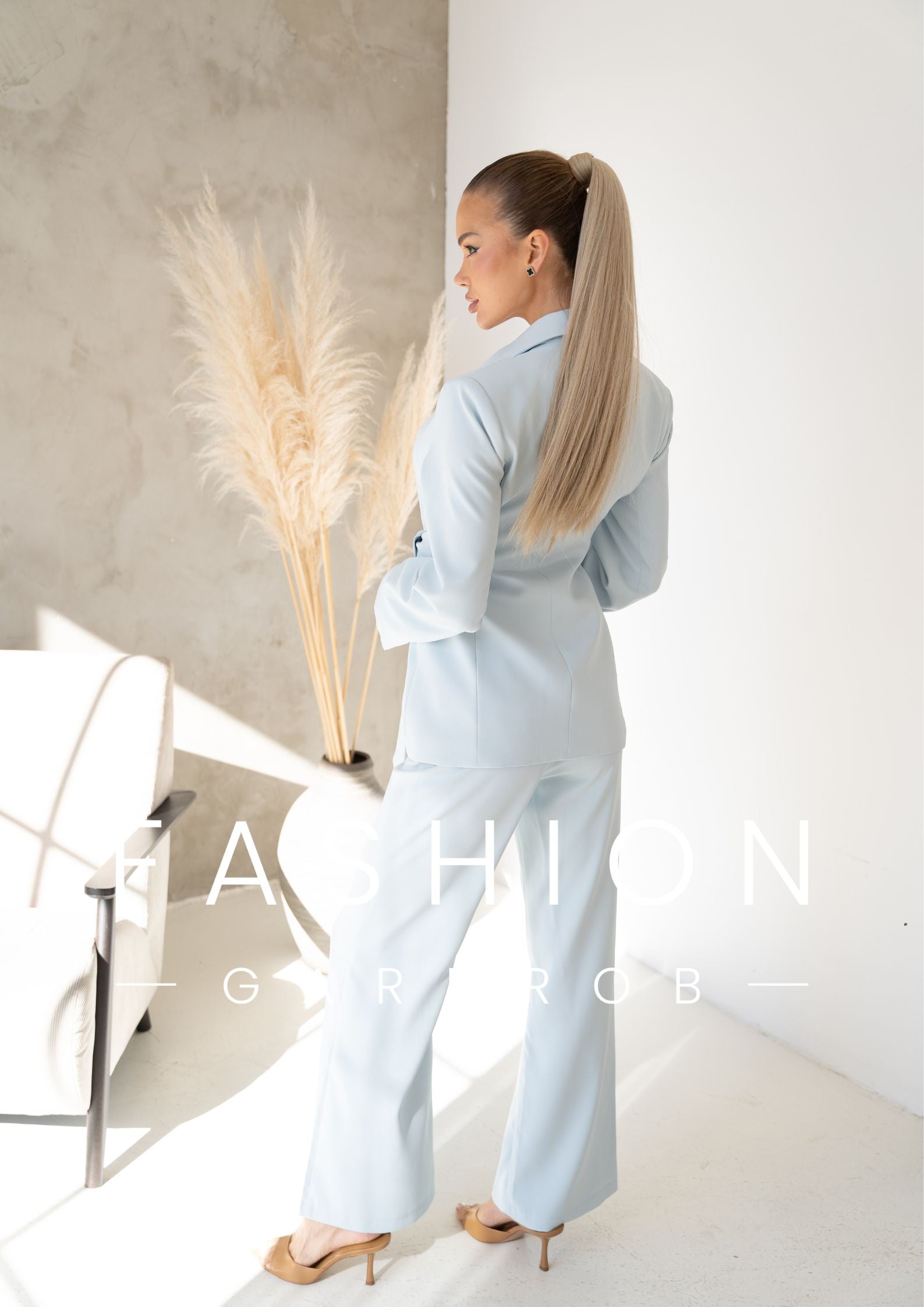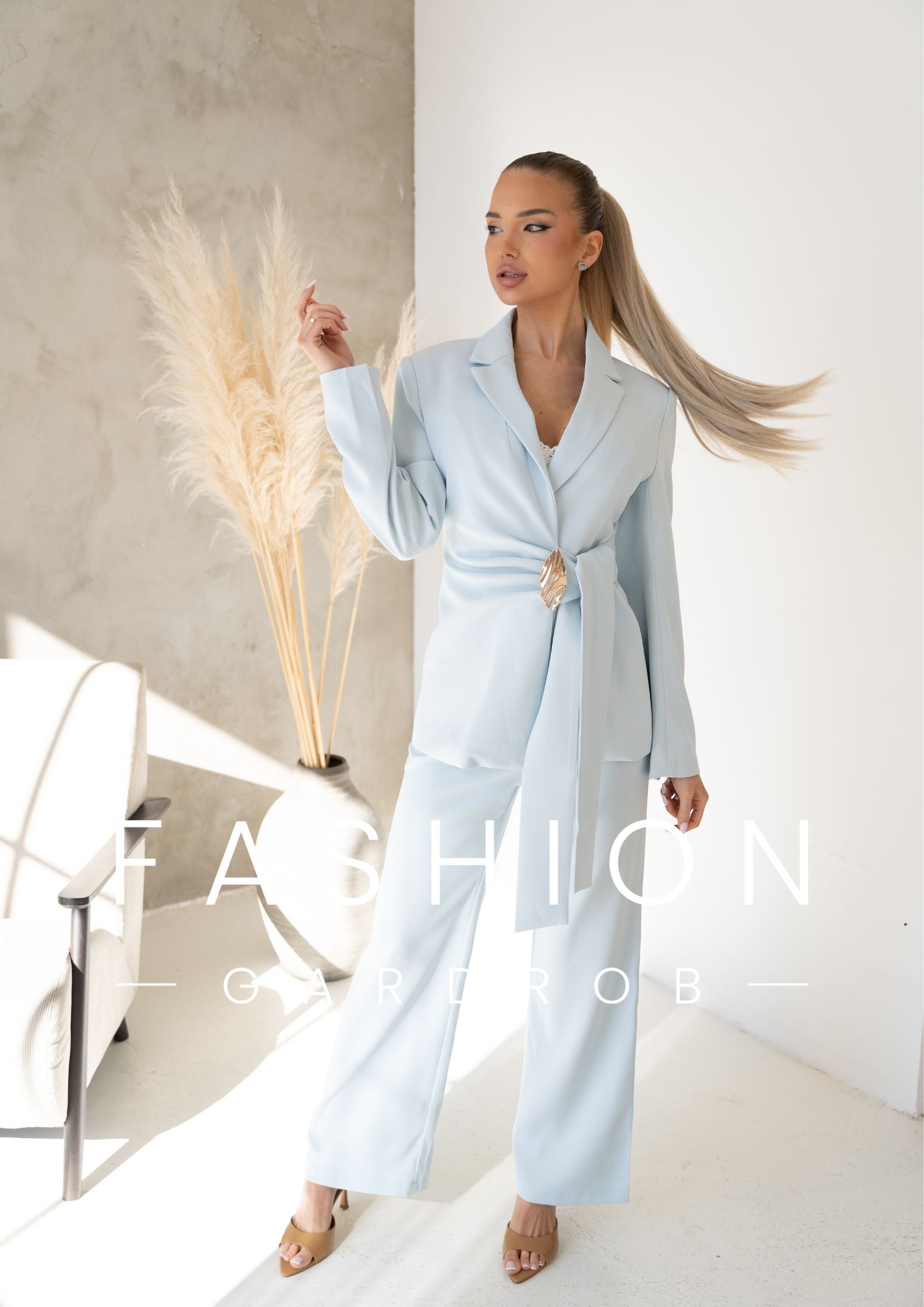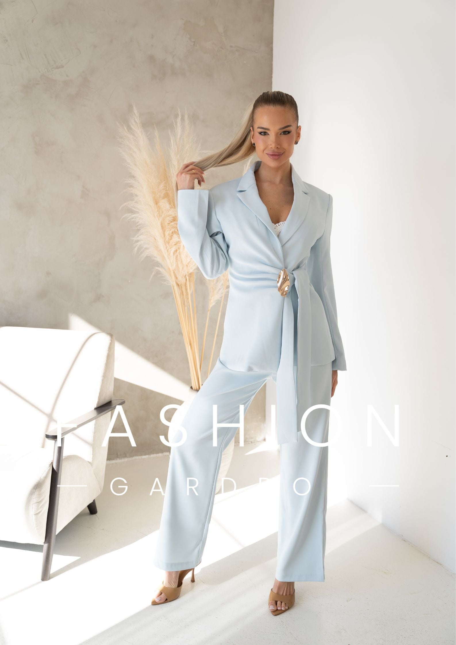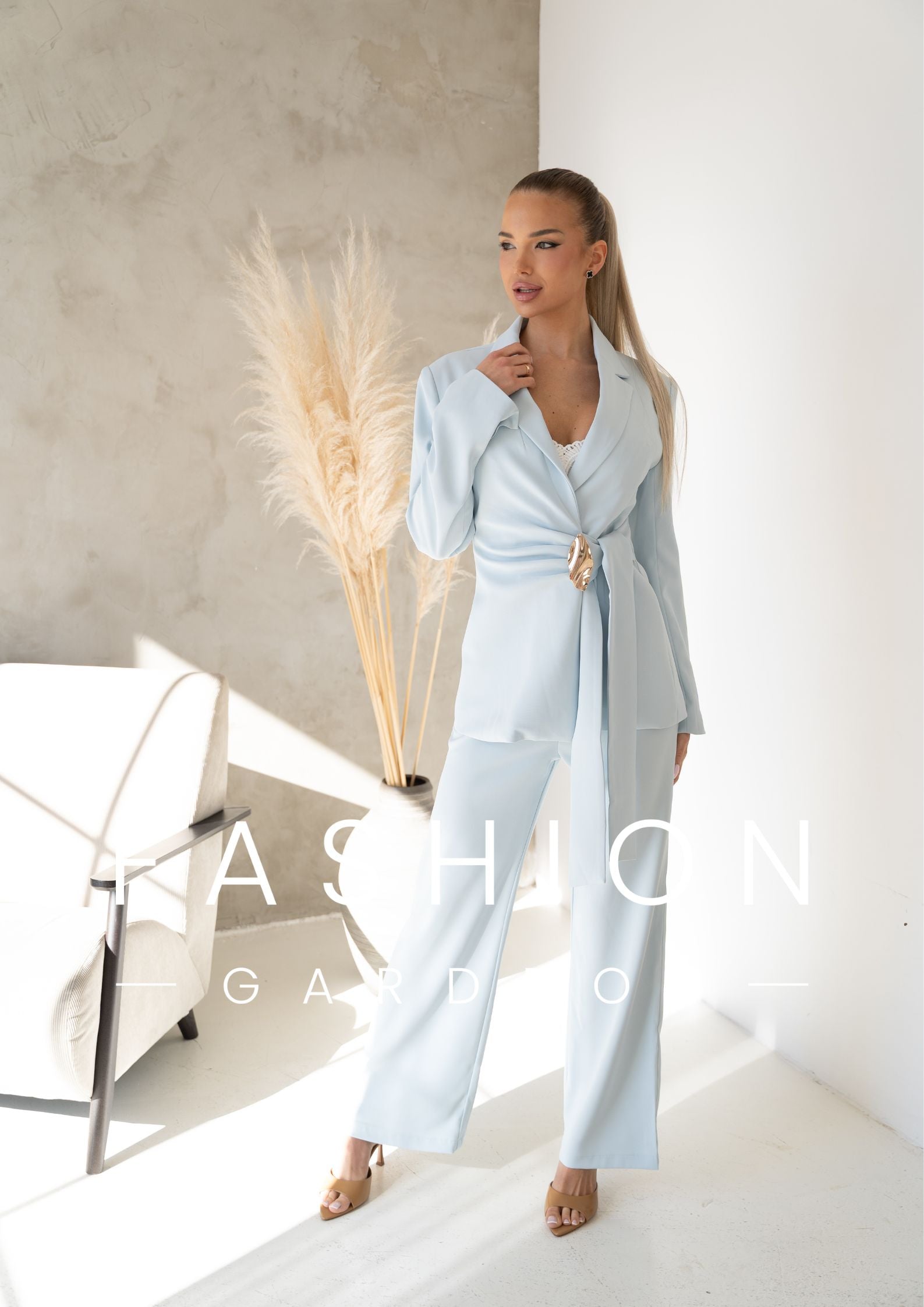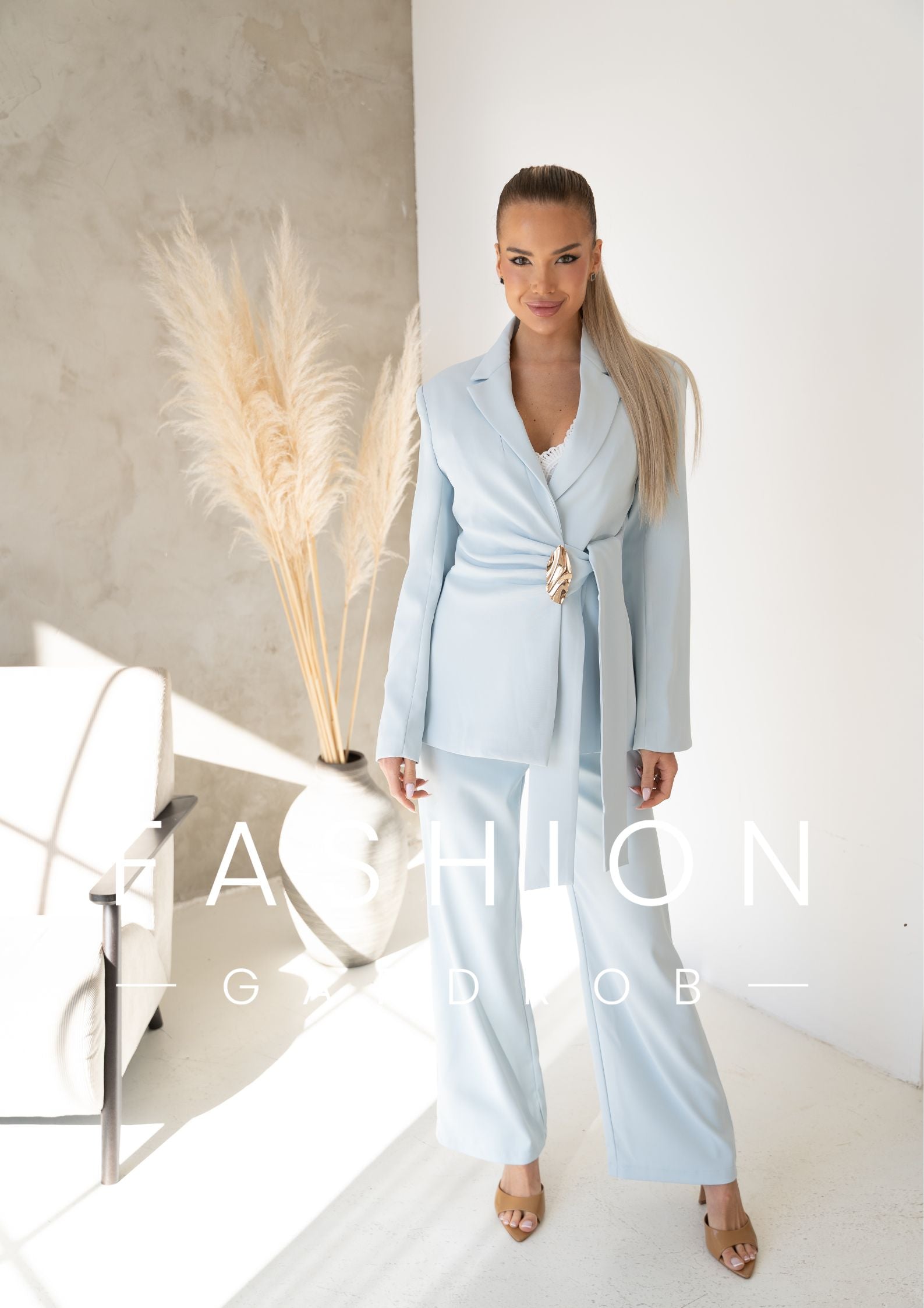Az öves, karcsúsított fazonú zakó gyönyörűen kiemeli a derekat, az arany díszcsat pedig luxus hatást kölcsönöz az összképnek. A hozzá tartozó, egyenes szárú nadrág légies esésével nyújtja az alakot, így a szett egyszerre kényelmes és rendkívül nőies.