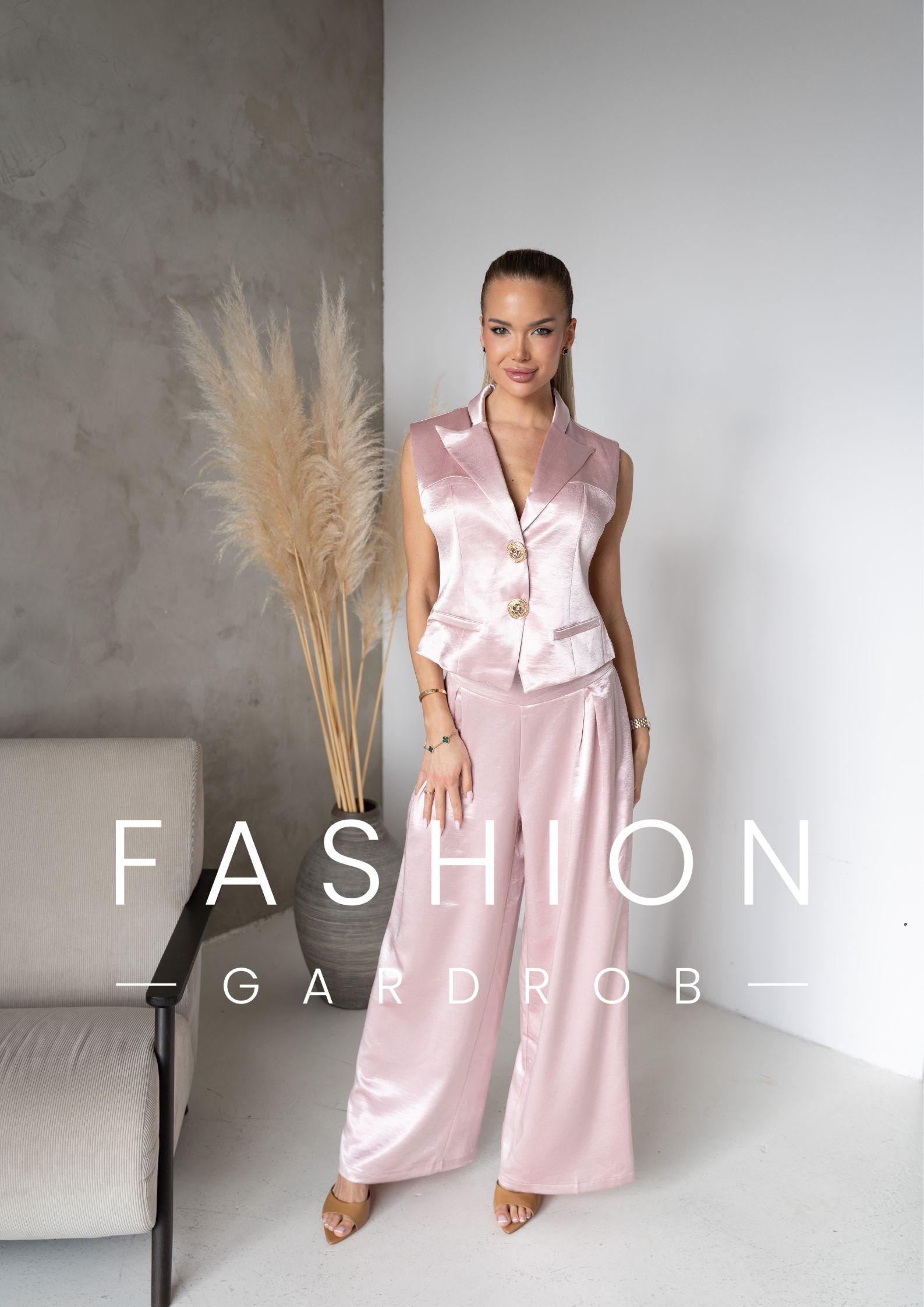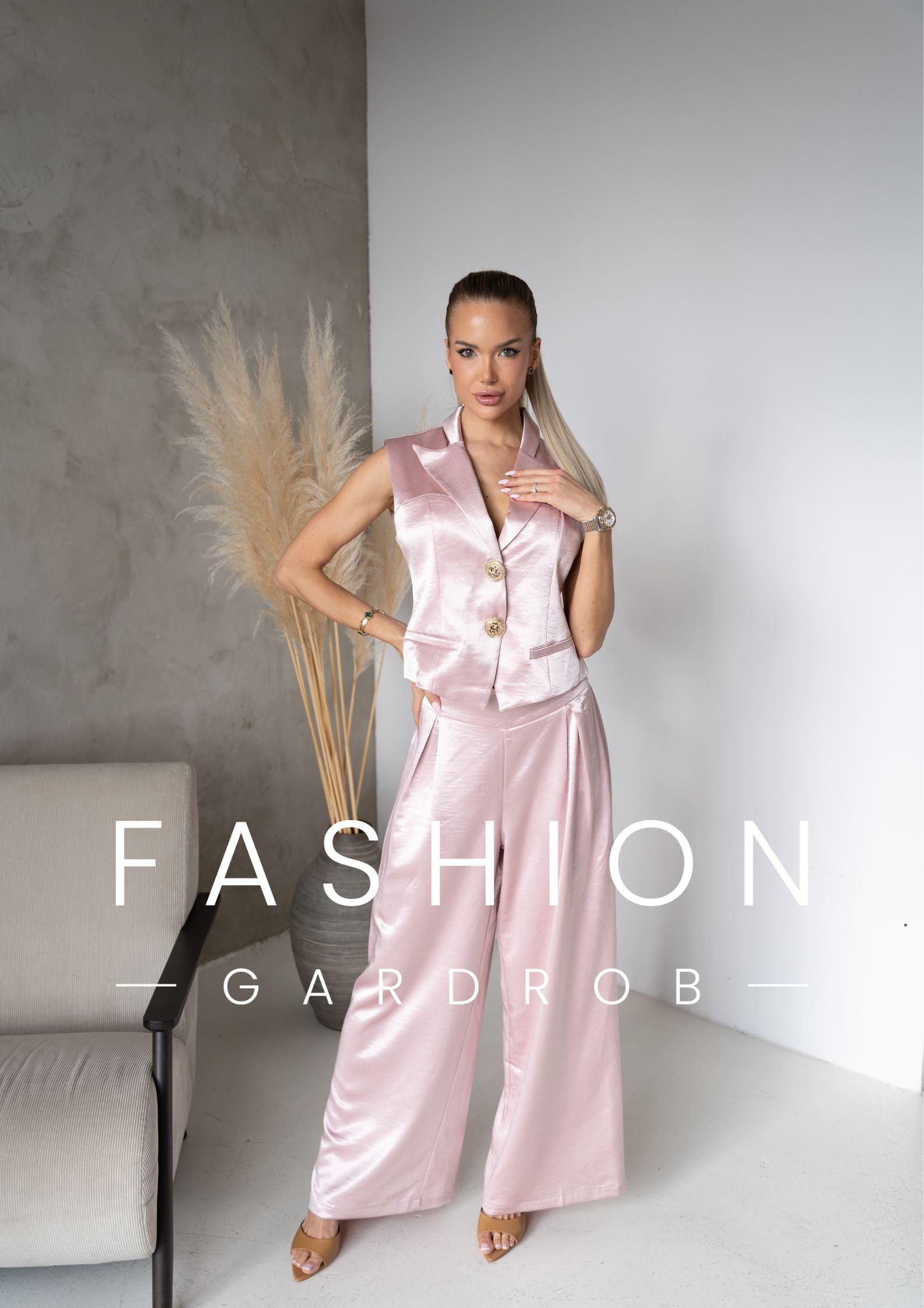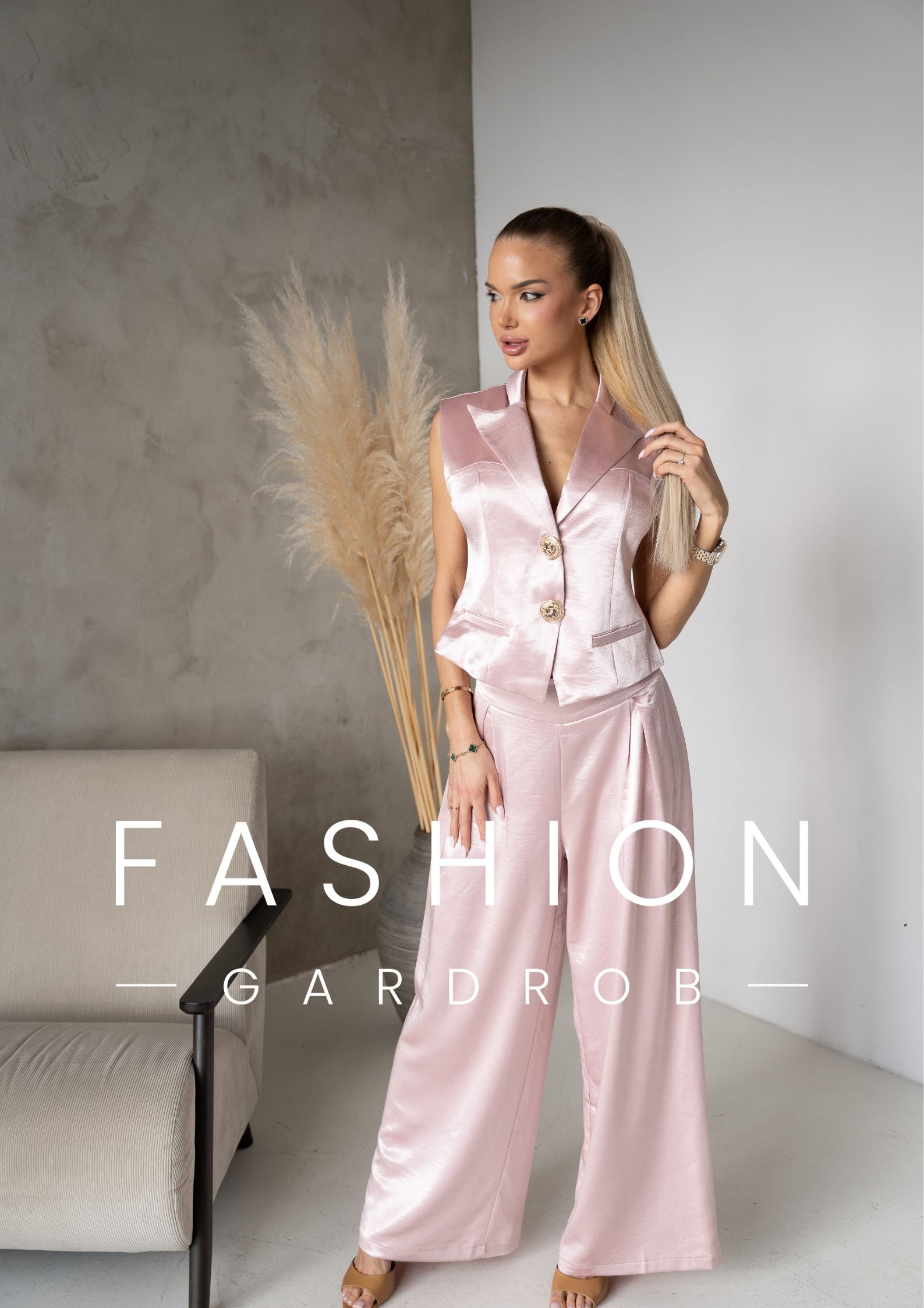 A púder rózsaszín árnyalat romantikus, mégis erőt sugárzó – ideális választás, ha stílusosan szeretnél kitűnni. A mellény önmagában is statement darab, együtt viselve pedig egy letisztult, luxus hatású outfitet alkot.