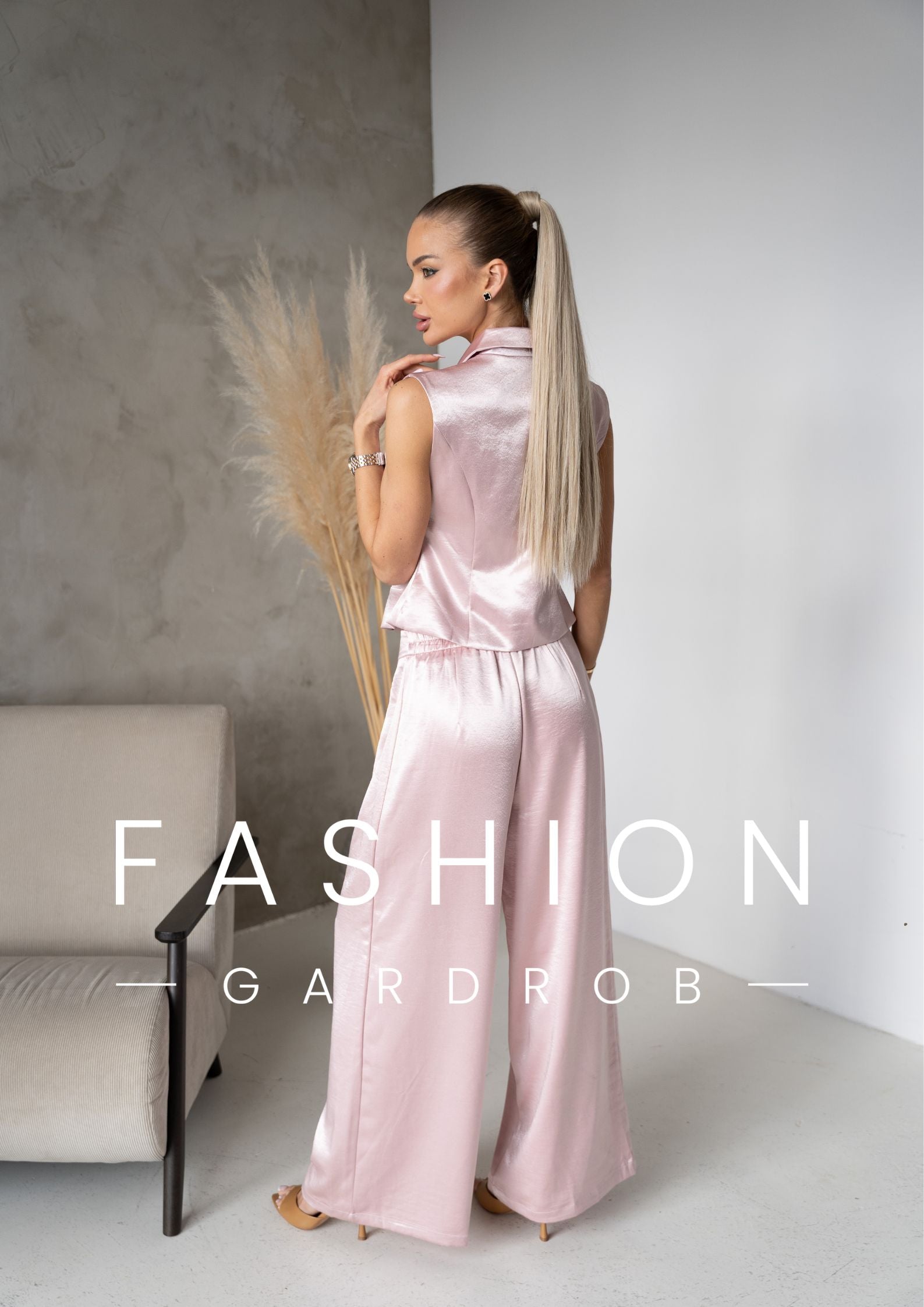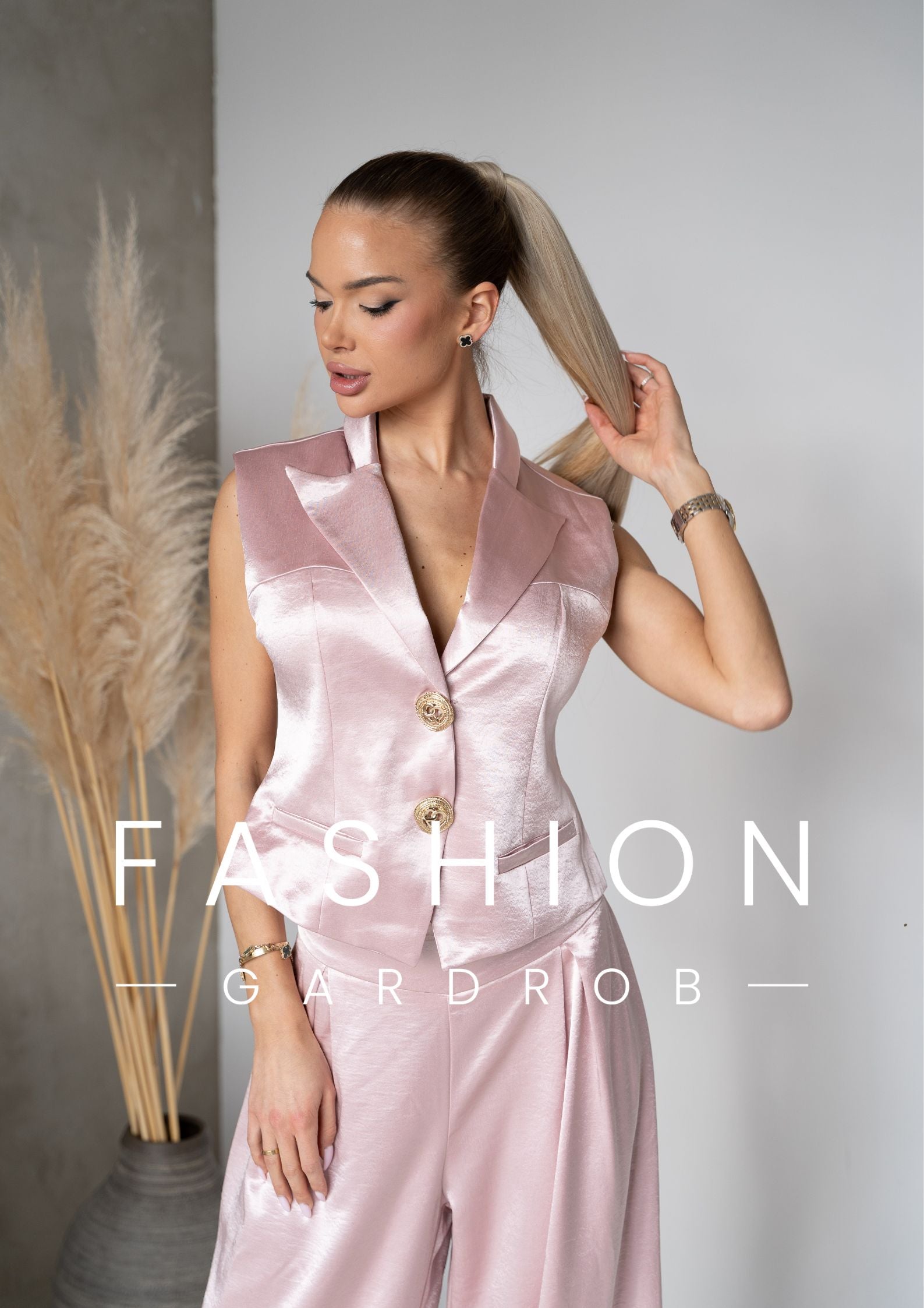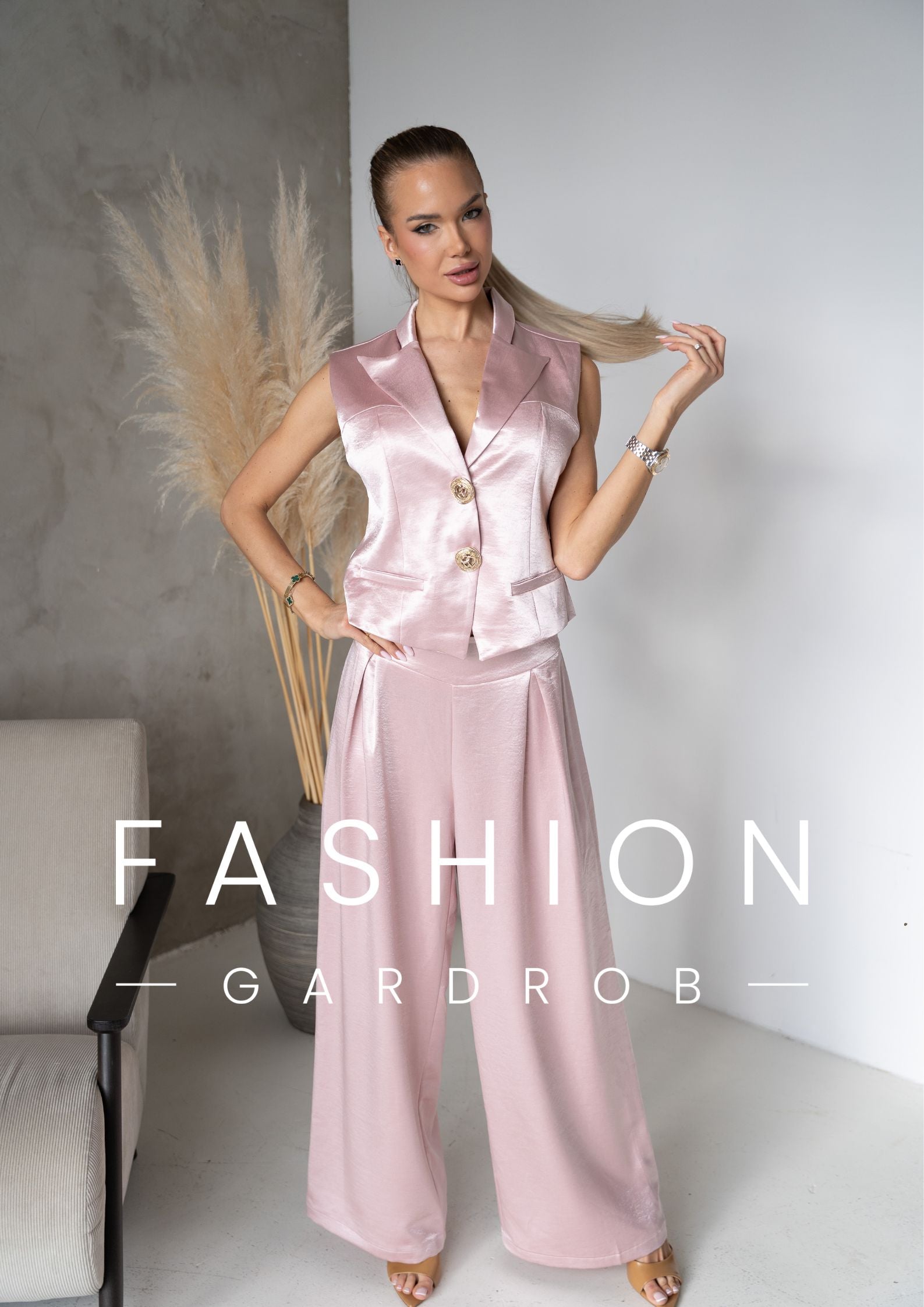 A púder rózsaszín árnyalat romantikus, mégis erőt sugárzó – ideális választás, ha stílusosan szeretnél kitűnni. A mellény önmagában is statement darab, együtt viselve pedig egy letisztult, luxus hatású outfitet alkot.